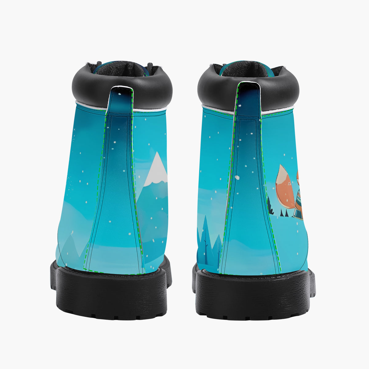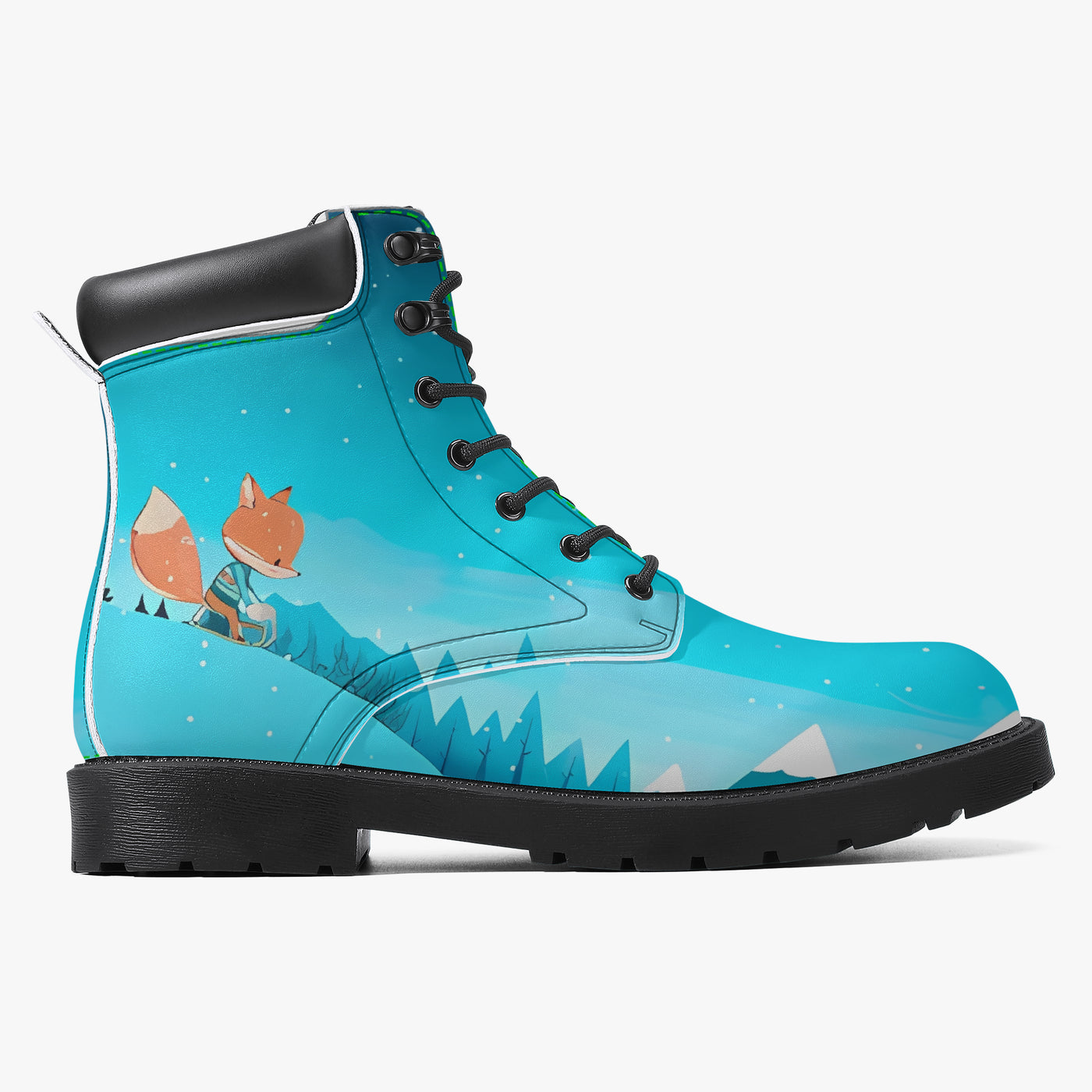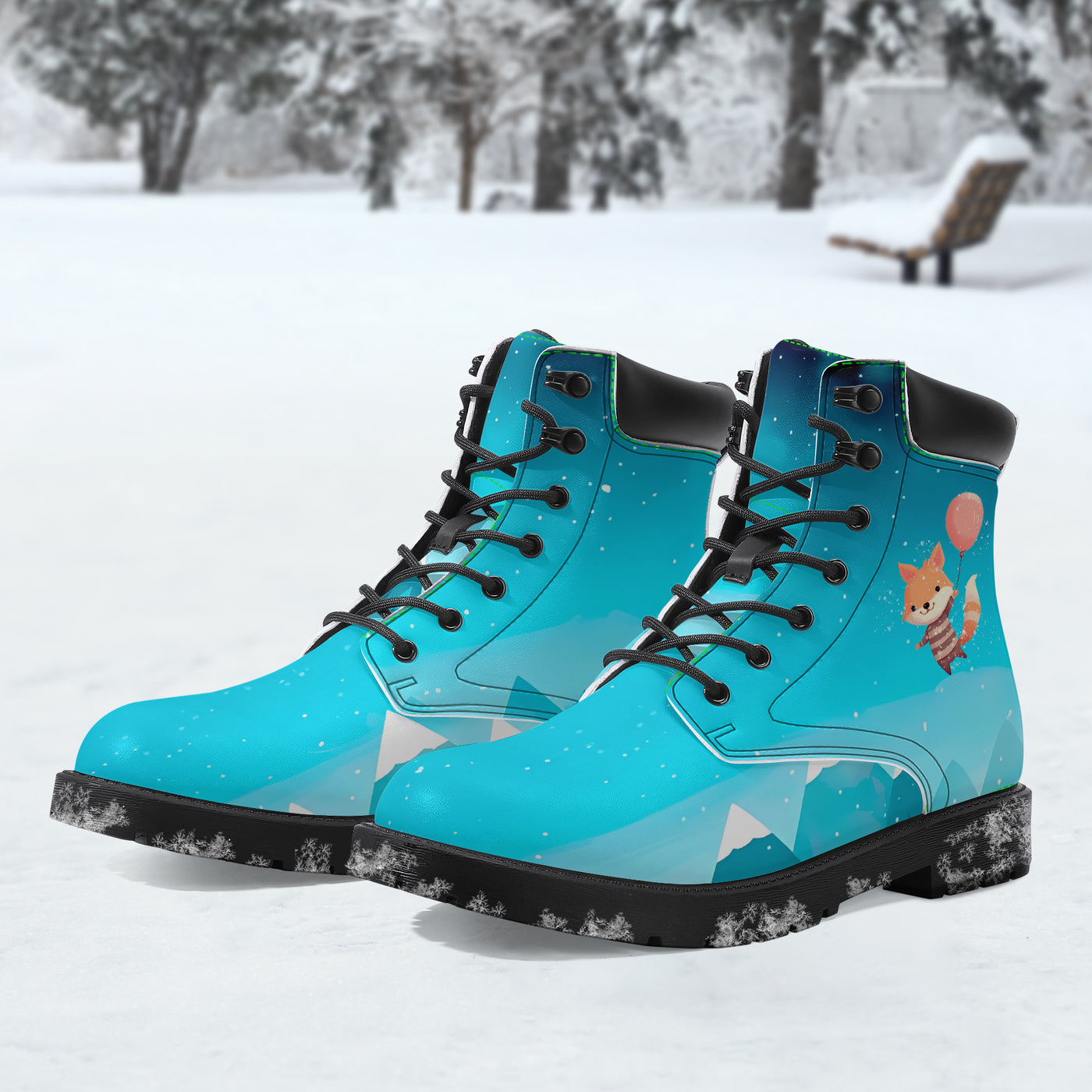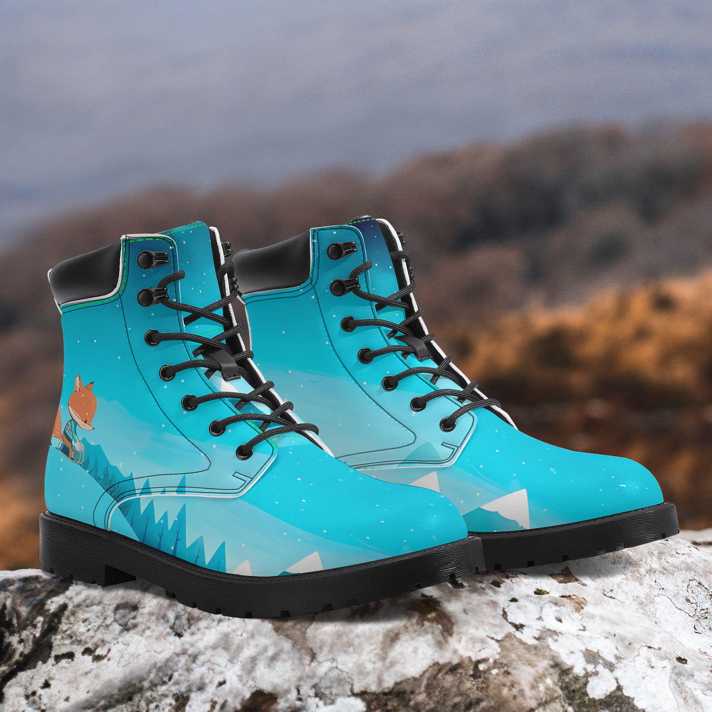 Estas botas de cuero destacan por su diseño ilustrado lleno de ternura y fantasía, pensado para quienes buscan un calzado diferente, original y con personalidad. El exterior presenta una ilustración delicada de un zorro en un paisaje invernal, con tonos azules suaves y detalles sutiles que evocan calma, aventura y mundo infantil.