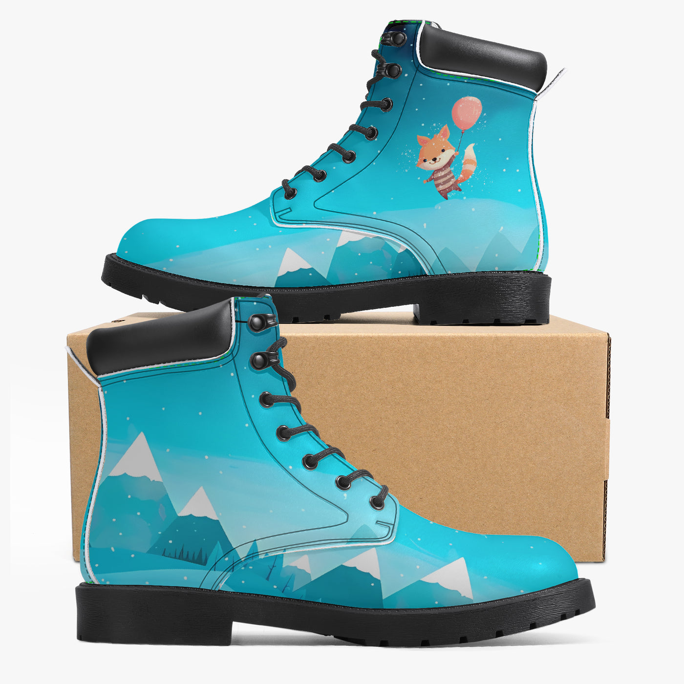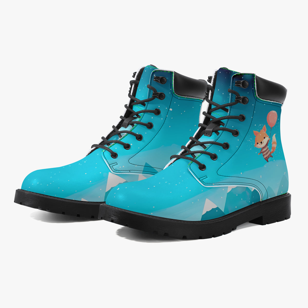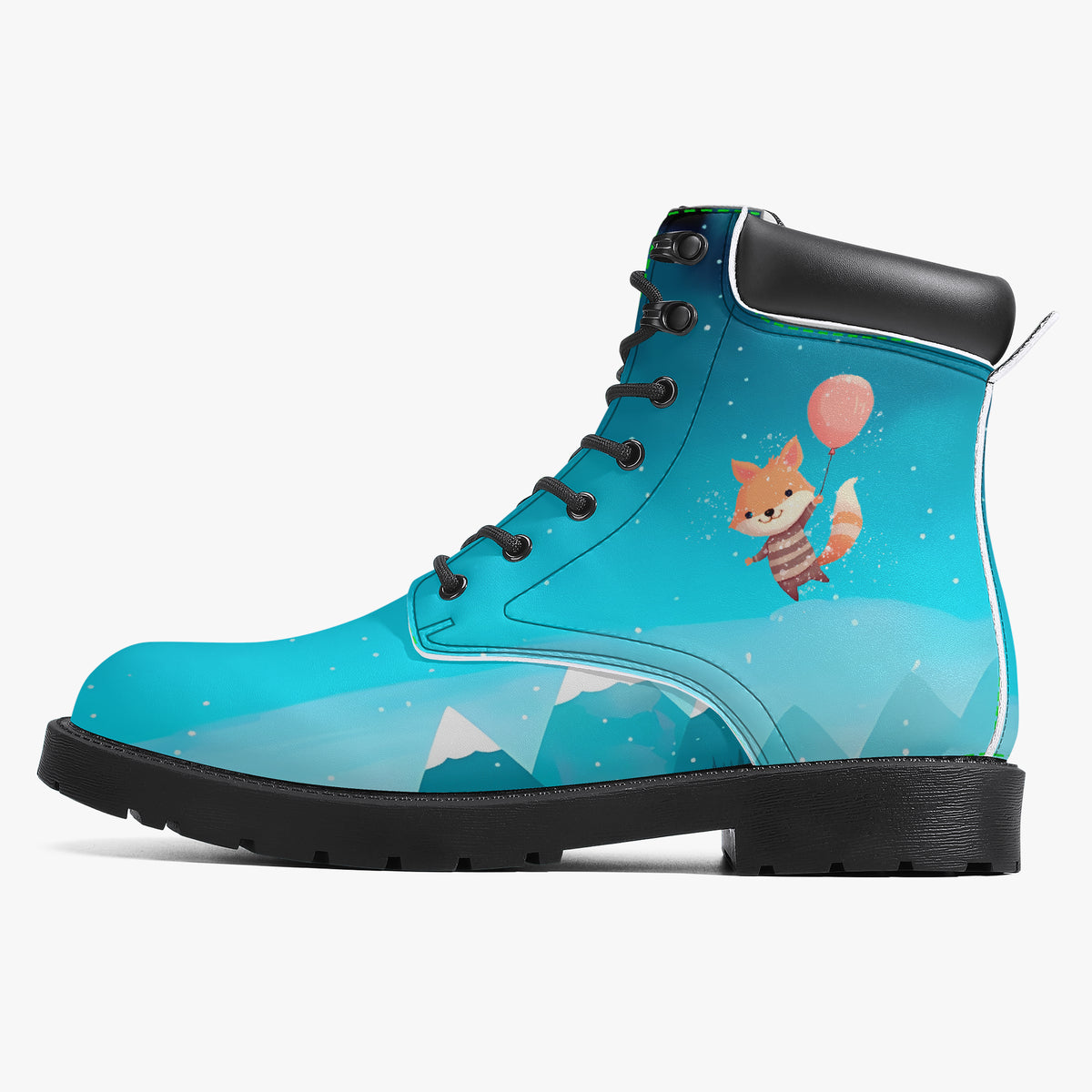 Estas botas de cuero destacan por su diseño ilustrado lleno de ternura y fantasía, pensado para quienes buscan un calzado diferente, original y con personalidad. El exterior presenta una ilustración delicada de un zorro en un paisaje invernal, con tonos azules suaves y detalles sutiles que evocan calma, aventura y mundo infantil.