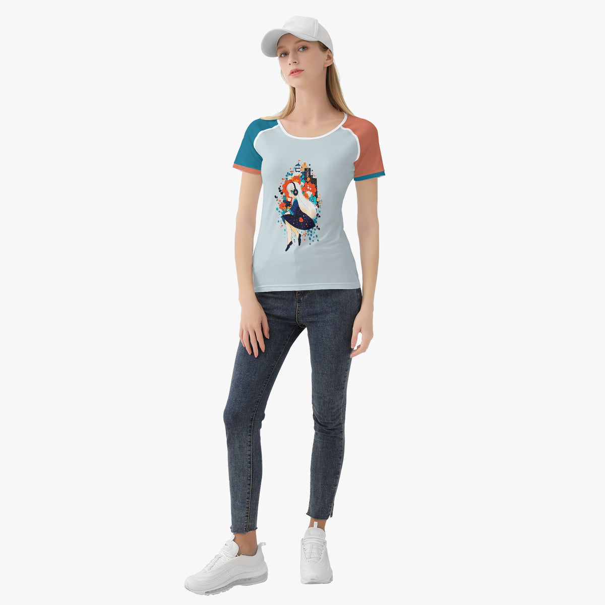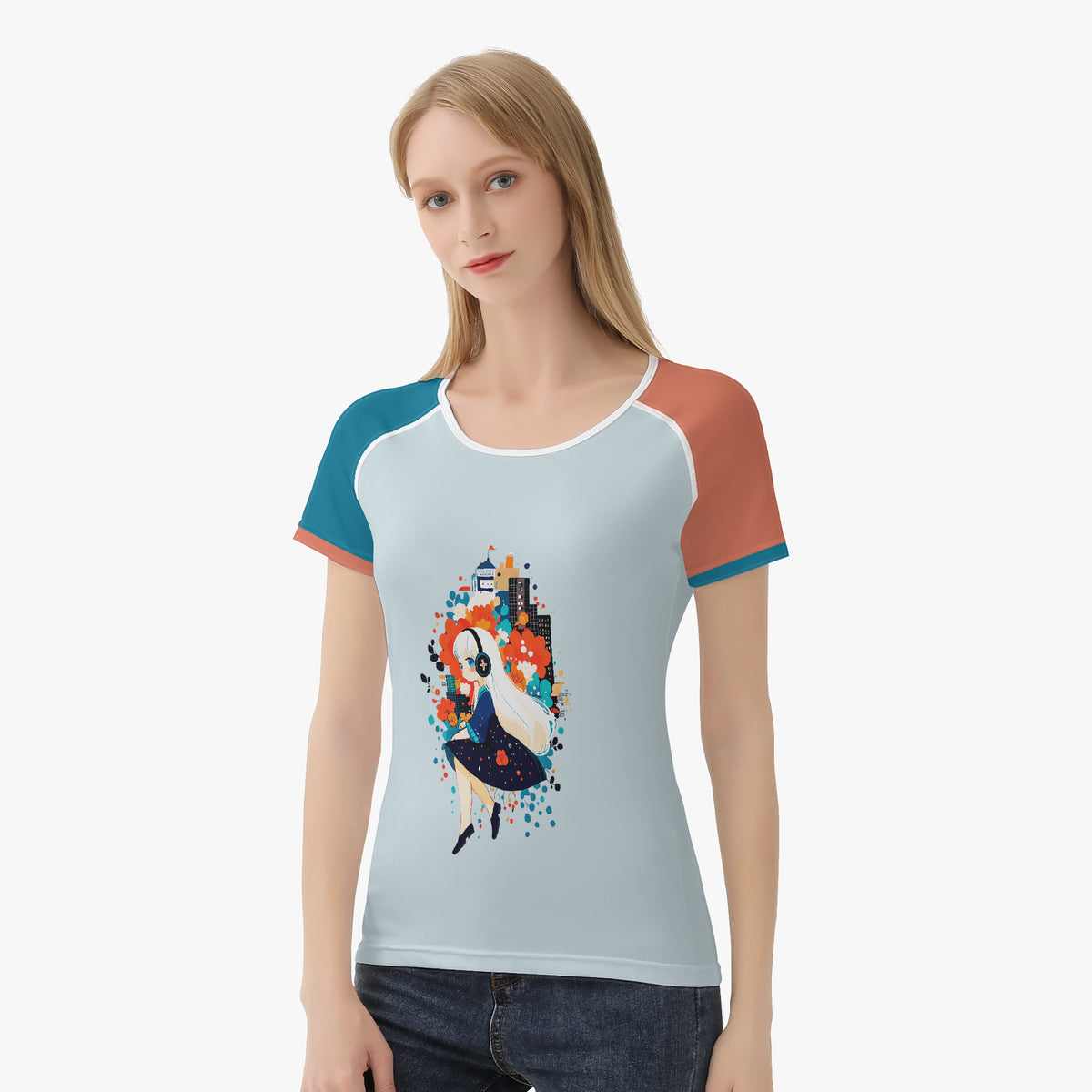 - Modelo raglan comfy (mangas estilo béisbol) en tonos teal y melocotón suave + cuerpo gris claro vintage.